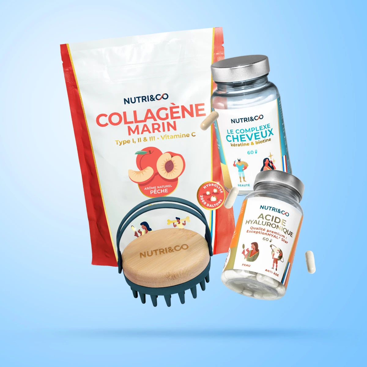 Le Pack Beauté prend soin de vos cheveux et de votre peau, grâce à l’association de nos formules Complexe Cheveux, Acide Hyaluronique et Collagène marin. En bonus dans ce pack : notre brosse massante pour le cuir chevelu.