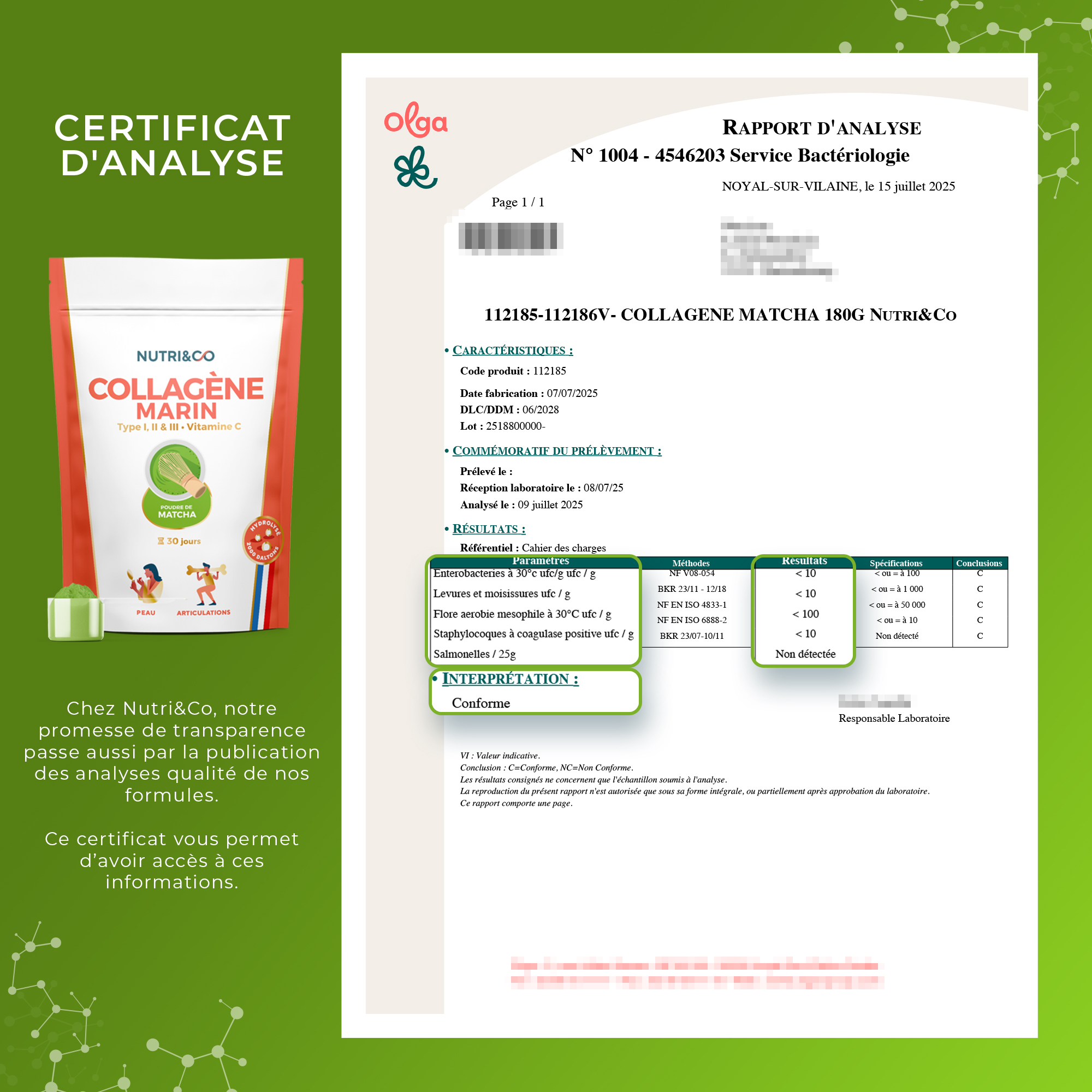 Ingrédients arôme matcha : Mix collagène marin hydrolysé [Collagène Naticol® (type I & III), Cartidyss® (type II) (poisson)], Poudre de matcha (Tencha, Camellia sinensis), Acide ascorbique (Vitamine C). Fabriqué dans un atelier utilisant : lait, œuf, soja, gluten, fruits à coque, mollusques, crustacés.