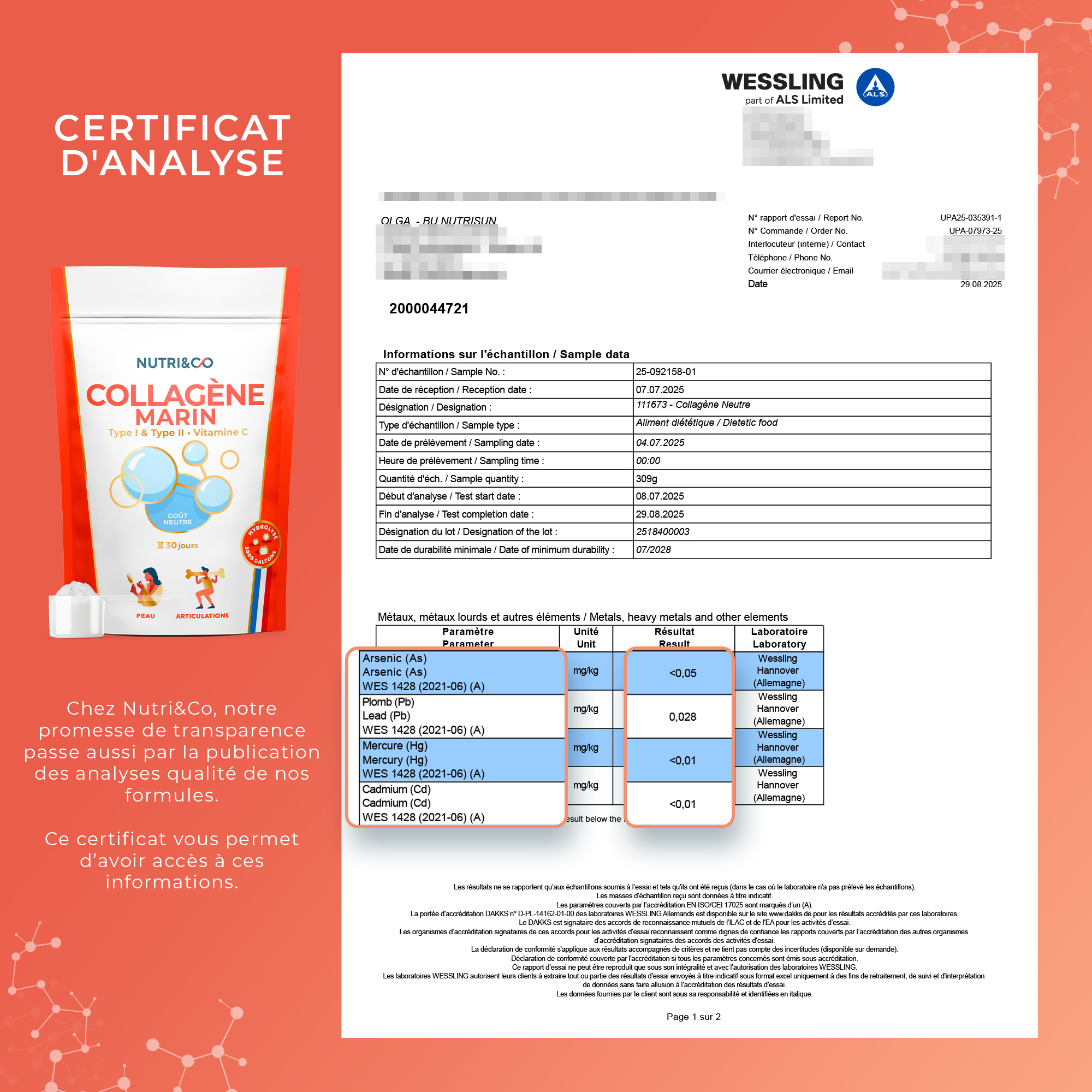 Ingrédients goût neutre : Mix collagène marin hydrolysé [Collagène Naticol® (type I & III), Cartidyss® (type II) (poisson)], Agent de charge : gomme d’acacia, Arôme naturel, Acide ascorbique (Vitamine C). Fabriqué dans un atelier utilisant : lait, œuf, soja, gluten, poisson, fruits à coque, mollusques, crustacés.