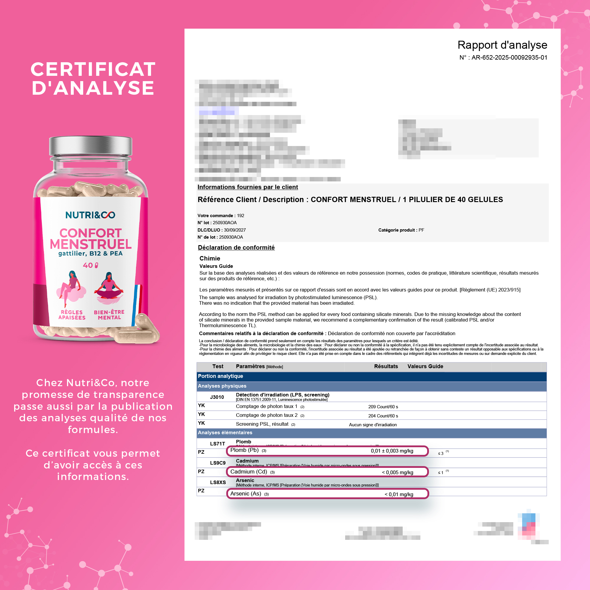 | Valeurs nutritionnelles du Confort Menstruel | Pour 2 gélules | Pour 4 gélules | % des AR* (pour 4 gélules) |
