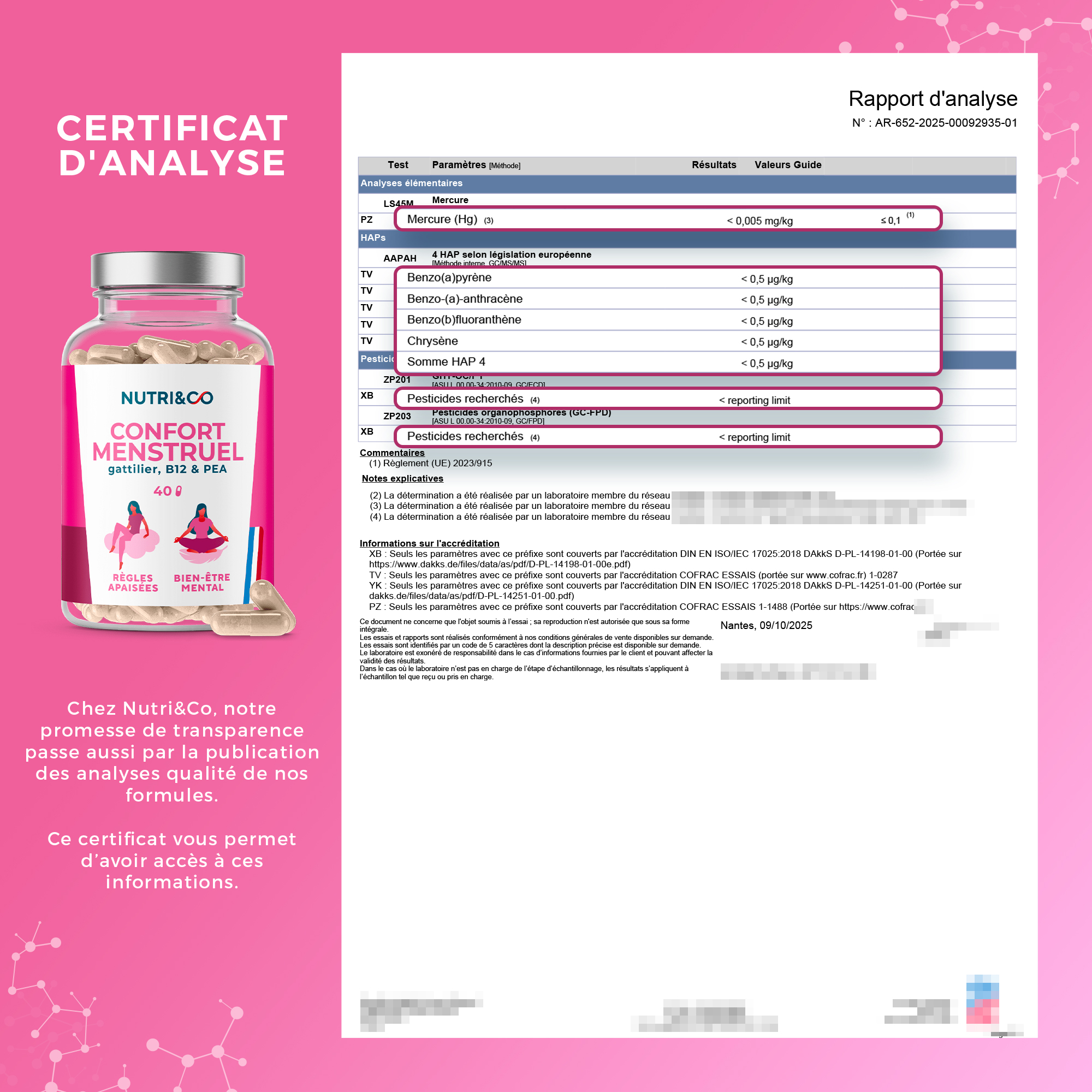 Ingrédients : ATA-Mg® : acétyltaurinate de magnésium, LevagenTM : palmitoyléthanolamide, Agent d’enrobage : hydroxypropylméthylcellulose, Extrait de fruit de gattilier (Vitex agnus-castus), Méthylcobalamine (vitamine B12).
